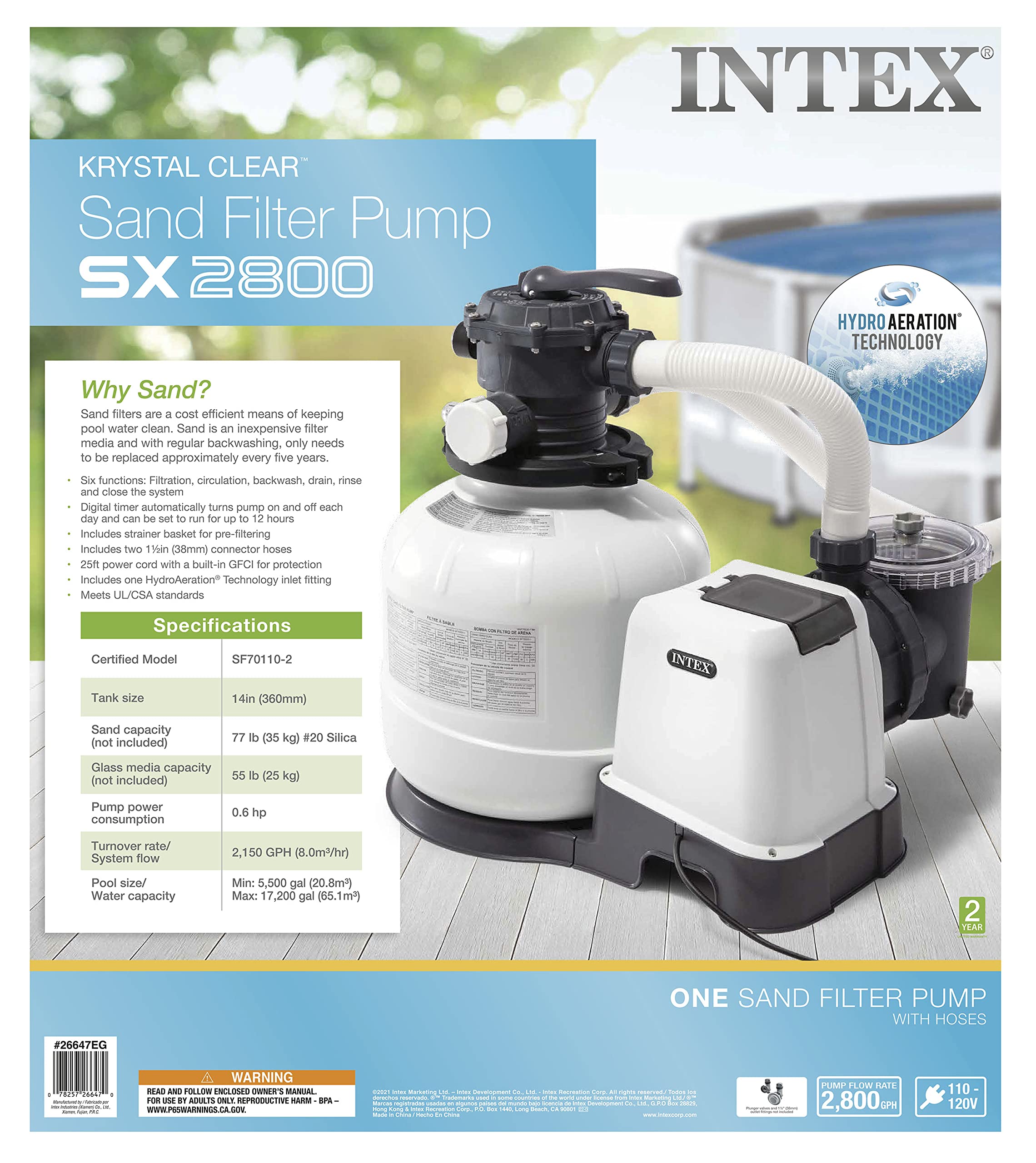 SAND FILTER PUMP: The 14-inch Intex Krystal Clear sand filter pump with Hydro Aeration Technology improves circulation and filtration and improves water clarity; The pump runs on 110-120V and weighs 45.87 pounds.